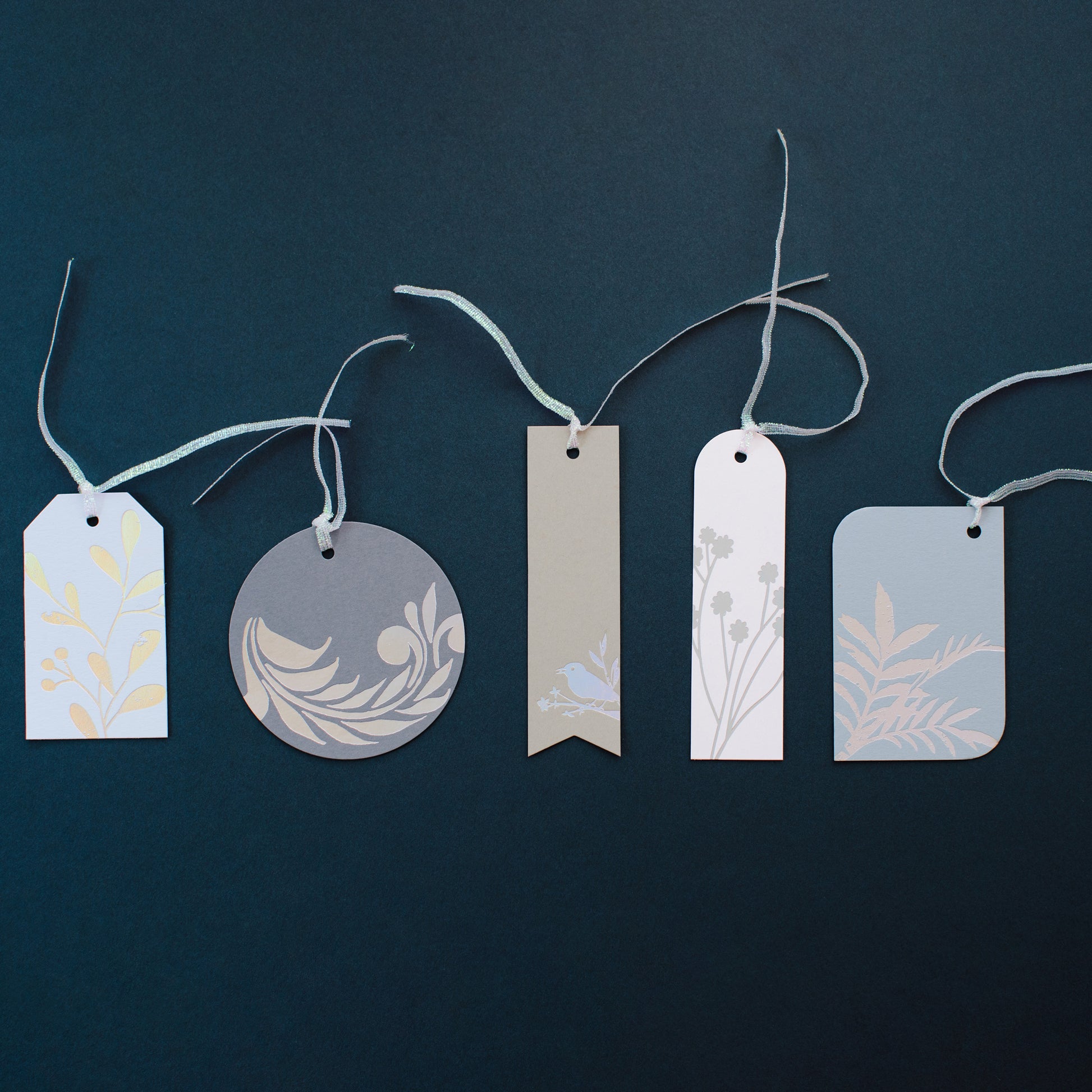 Five holographic hot foil stamped gift tags with waxed cord.